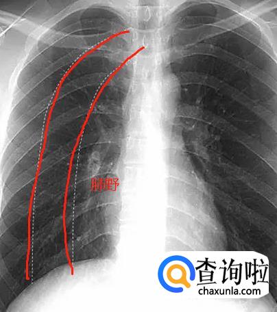 肺野。肺野是X线平片的专有名词,指含有空气的两肺在胸部X线平片上的投影。肺野纵向分区,一侧肺野纵行3等分,称为内、中、外带;肺野横向分区,分别通过第2、4肋骨前端下缘画一水平线,将肺野分为上、中、下3野 。