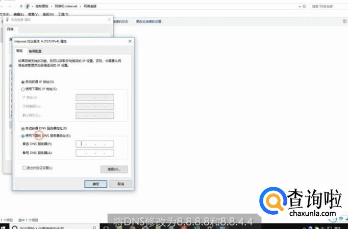 在网络连接上右键,选择属性。双击internet协议版本4,将DNS修改为8.8.8.8和8.8.4.4,点击确定即可。