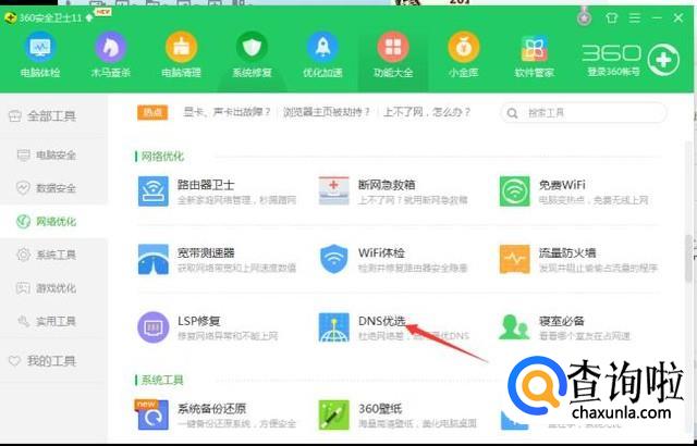 在出现的工具栏,点击左侧的网络优化。在右侧就会出现多个和网络有关的工具,点击dns优选。
