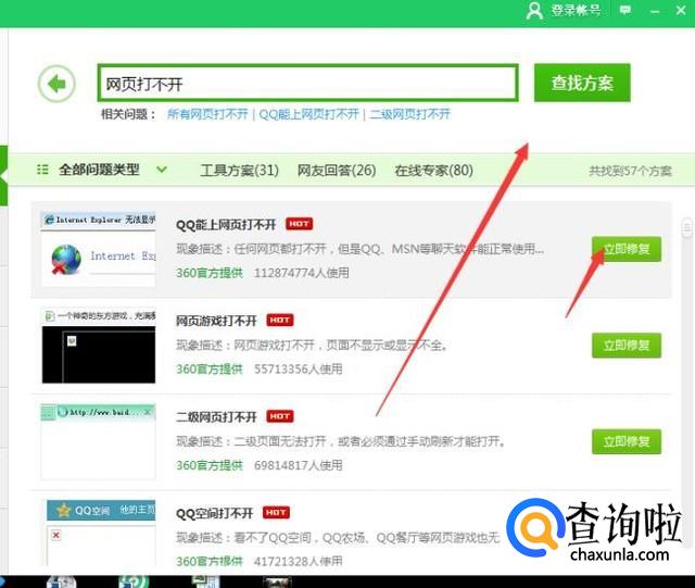 在人工服务“查找方案”栏输入:网页打不开,点击搜索就可以看到解决的方案,点击下面的立即修复。