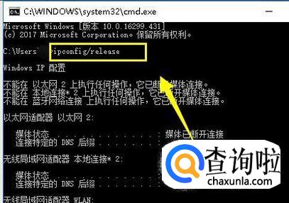 排除网络借口方面的问题:右键单击开始按钮,选择运行,在运行窗口输入cmd,点击确定按钮,进入cmd命令窗口,输入 ipconfig/release回车。