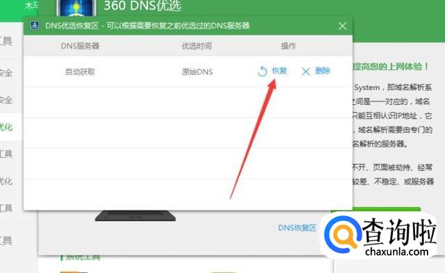 在恢复区页面可以看到自动获取原始dns选项,点击恢复就可以了。