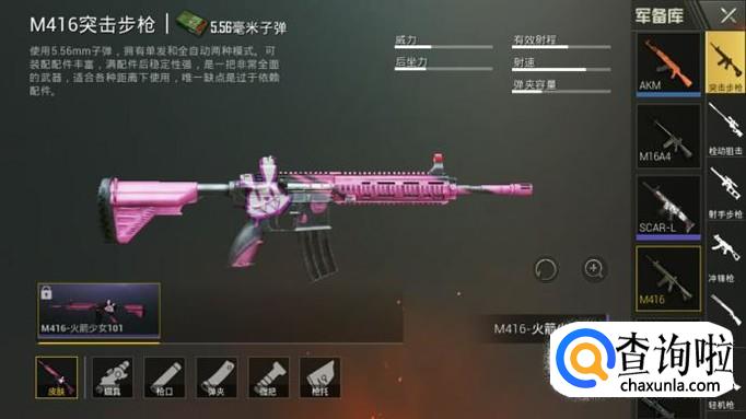 M416突击步枪皮肤只有一种,那就是M416-火箭少女101。UMP9-火箭少女101皮肤通过活动获取,现在活动已经结束了。皮肤如图所示。