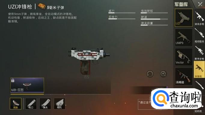 UZI冲锋枪皮肤只有一种,那就是UZI-狂怒。可以在“金币补给箱”中通过金币抽取获得。皮肤如图所示。