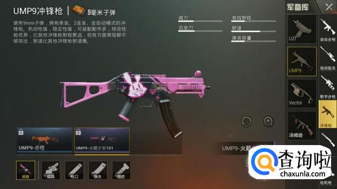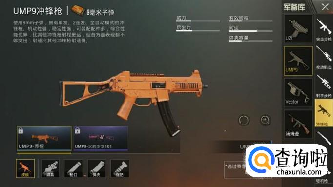 UMP9冲锋枪有两款皮肤,分别是UMP9-赤橙和UMP9-火箭少女101。其中UMP9-赤橙皮肤通过赛季每日宝箱获取,这个就要看运气啦。UMP9-火箭少女101皮肤通过活动获取,现在活动已经结束了。皮肤如图所示。