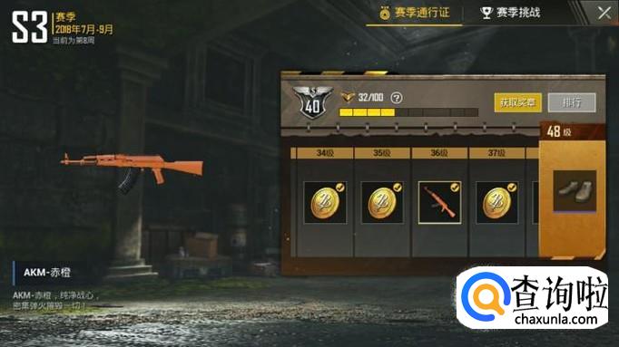 怎样获得这些皮肤呢,首先说最容易获得的AKM突击步枪的皮肤,AKM-赤橙。S3赛季版本更新后有“赛季通行证”的活动,只要你的通行证等级达到36级,就可以免费获得AKM-赤橙的皮肤啦~皮肤如图所示。。小伙伴们快去做通行证的挑战任务吧!