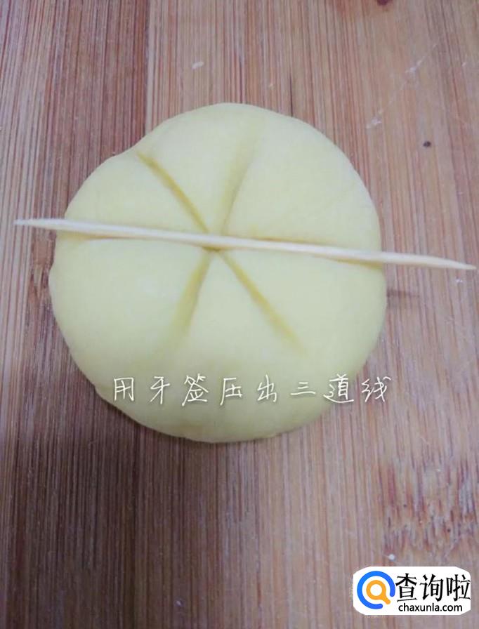 接着把白面按扁,包上豆沙,收口揉圆并用牙签压出三道线,如下图所示。