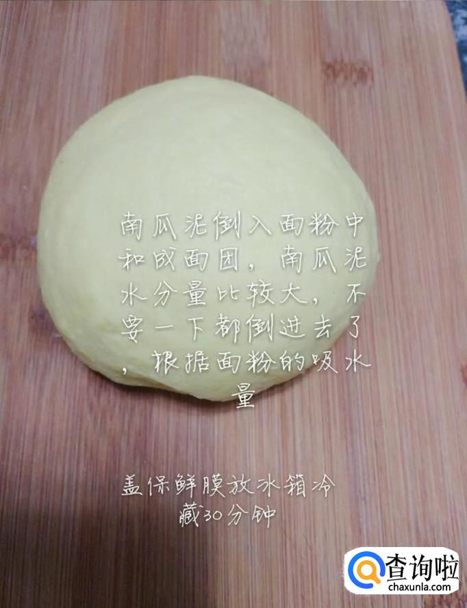 接着把所有的食材混合在一起搅拌均匀,揉成光滑的面团,盖上保鲜膜,放入冰箱冷藏30分钟,如下图所示。
