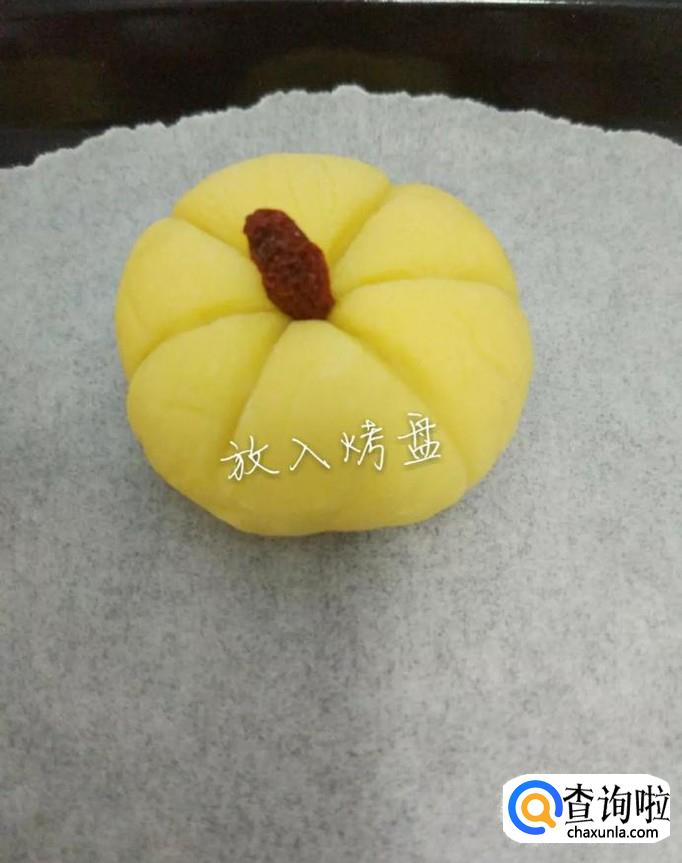 接着把做好的南瓜发糕放到烤盘中,如下图所示。