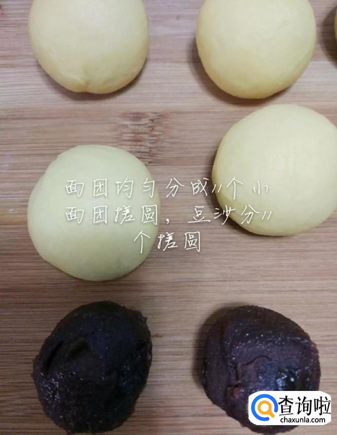 然后将面团分成11个大小均匀的剂子搓圆,豆沙也分成11份搓圆,如下图所示。