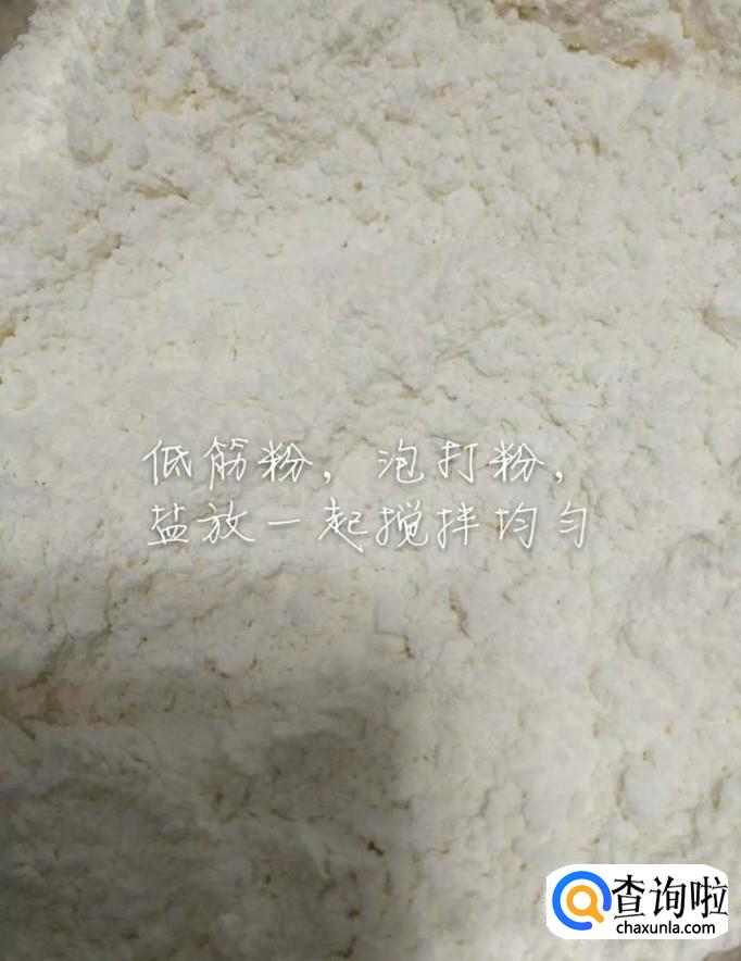 然后在另一个容器中加入低筋面粉、泡打粉和盐一起搅拌均匀,如下图所示。