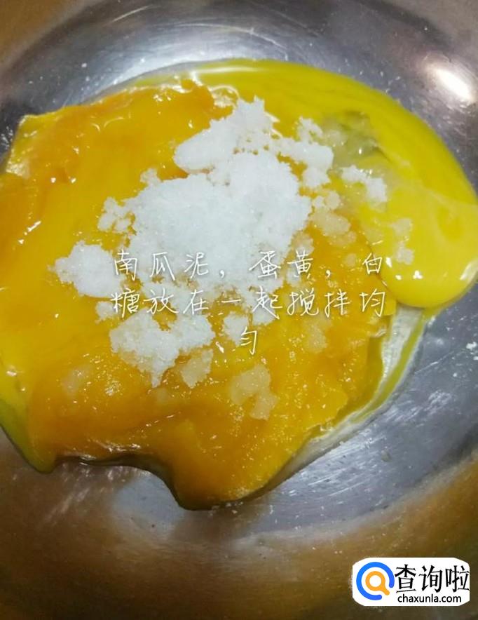 首先在一个容器当中加入南瓜泥、蛋黄和白糖搅拌均匀,如下图所示。