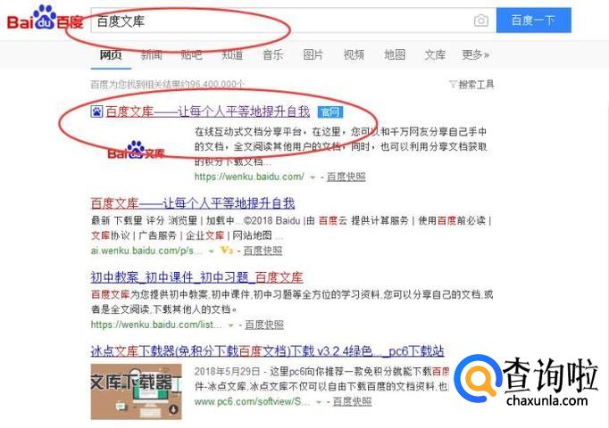 在浏览器中搜索“百度文库”,然后在下方找到具有官网标志的链接,如下图所示: