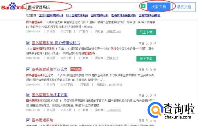 在百度文库网中可以通过关键字来搜索相关的文档,比如搜索有关“图书管理系统”的文档,如下图所示: