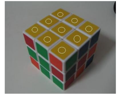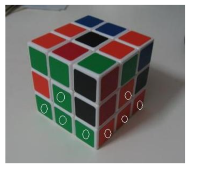 四侧面顶层两边方块对位,指的四侧面上层两角的方块归位,归位并不是指颜色要对上,只要这块的颜色和所在的三个面的颜色相对应就行,如下图所示。
