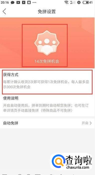 在免拼设置页面,小编的页面显示“剩余14个免拼机会”,如果想获得更多的免拼机会,可以通过确认收货进行获取。