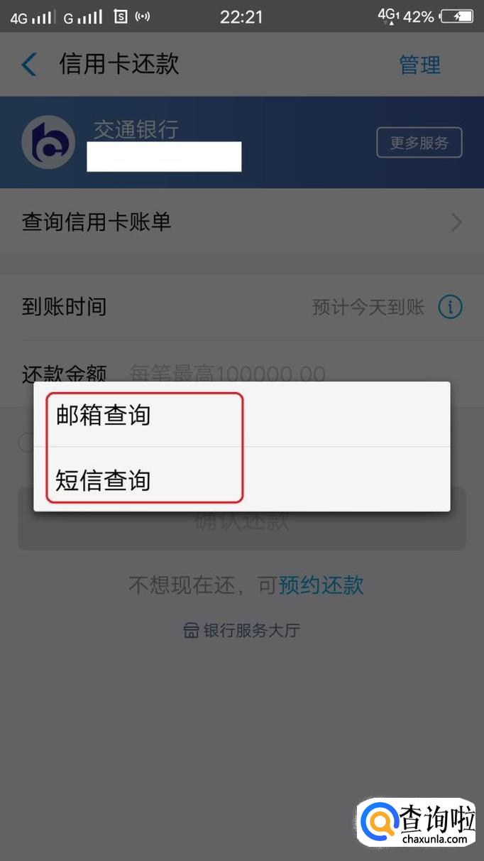 点击进入该信用卡的还款页面,点击“查询信用卡账单”,可以看到,有“邮箱查询”和“短信查询”两种途径获得信用卡账单。