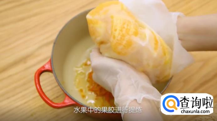 准备一个过滤包,把橙子的果肉全部放进去,戴上手套,将果汁使劲挤入锅中。因为制作果酱需要对水果中的果胶进行提炼,橙子是富含果胶的水果,不过都分部在橙皮和橙络里,所以要先把果汁挤出去。
