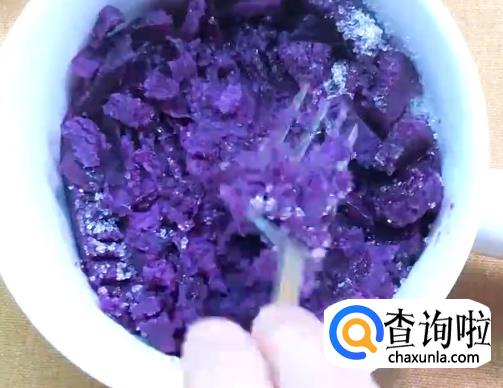 将紫薯倒入锅中,用勺子或铲子碾压熟透的紫薯成为紫薯泥。