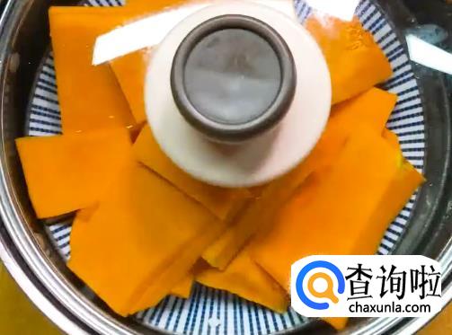 先将洗好的紫薯和南瓜切片,然后放进蒸笼里大火蒸熟。