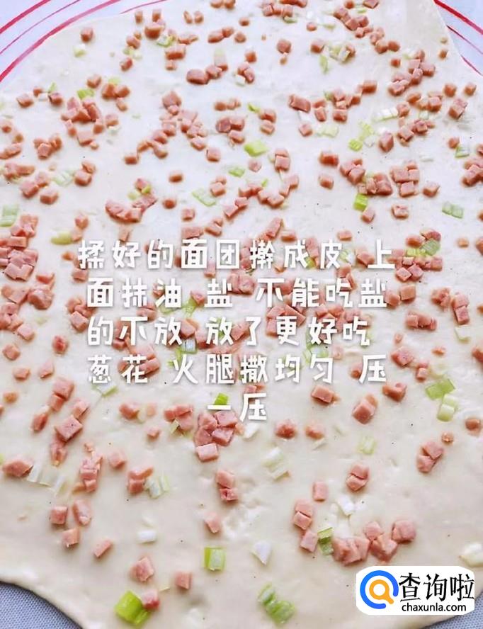 然后把发酵好的面用擀面杖擀成面皮,撒上火腿丁、葱花和适量的盐,如下图所示。