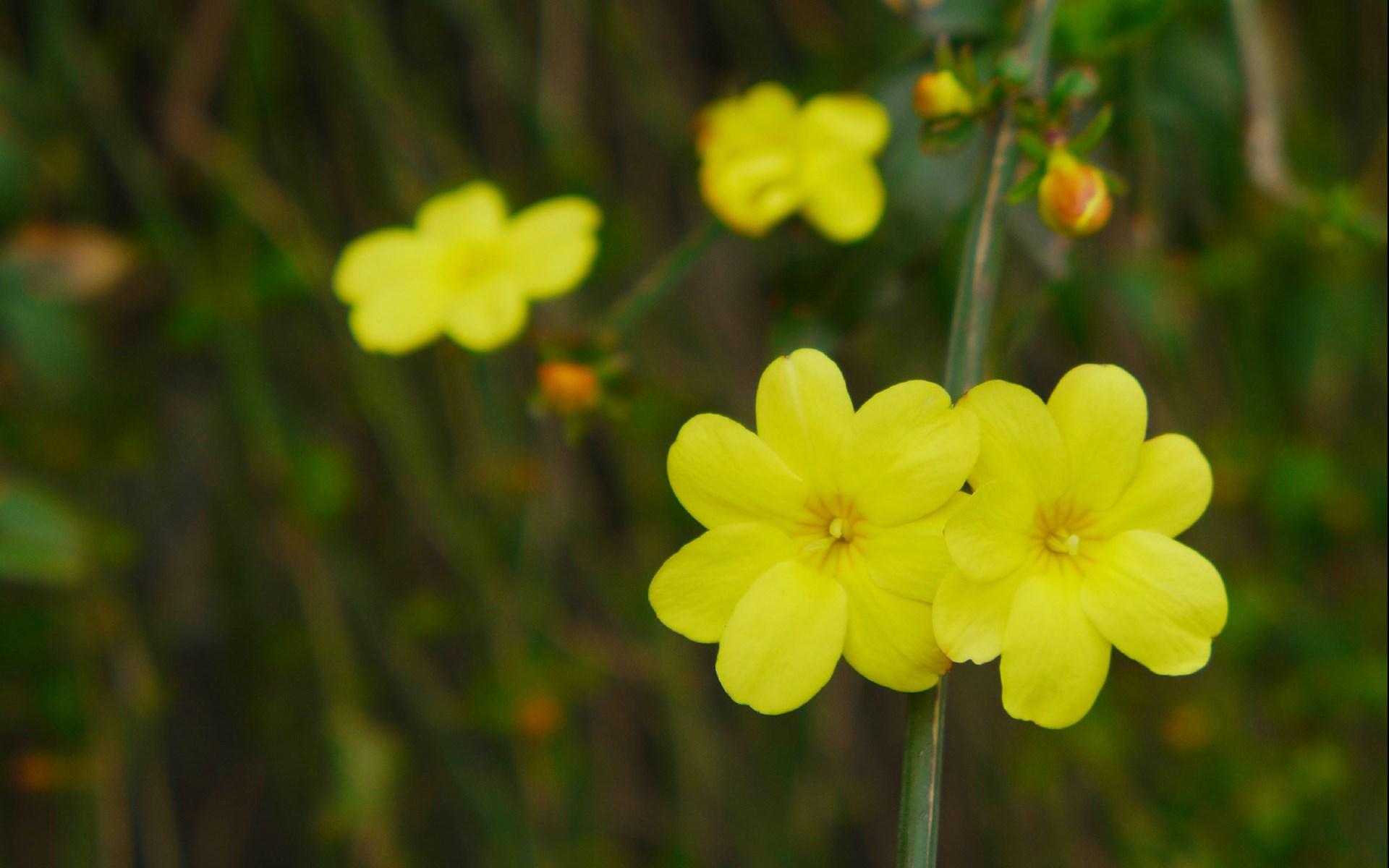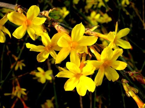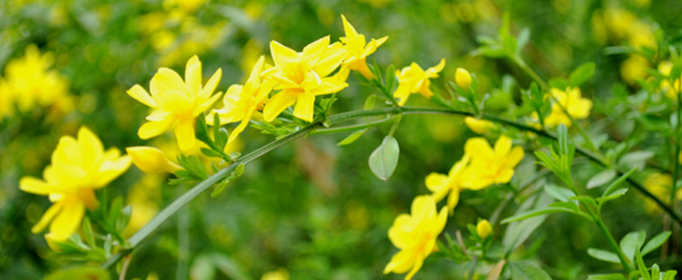 迎春花(学名:Jasminum nudiflorum Lindl. ):别名迎春、黄素馨、金腰带,落叶灌木丛生。株高30-500厘米。小枝细长直立或拱形下垂,呈纷披状。3小叶复叶交互对生,叶卵形至矩圆形。花单生在去年生的枝条上,先于叶开放,有清香,金黄色,外染红晕,花期2-4月。因其在百花之中开花最早,花后即迎来百花齐放的春天而得名。