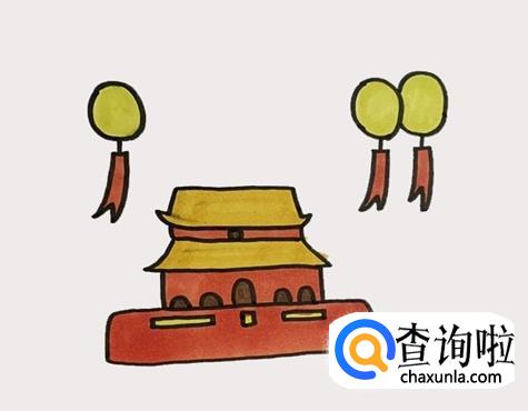 最后将墙壁涂红,城墙上的长条标语与相框涂上黄色后,再给气球涂黄,条幅涂红,北京天安门就涂好颜色了。