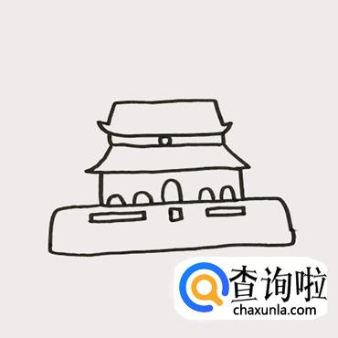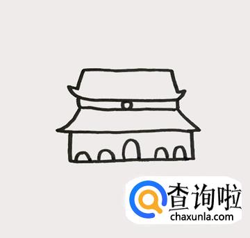 首先画出天安门的檐顶,画出两侧的飞檐后,将上层的檐壁与圆形牌匾画出来。