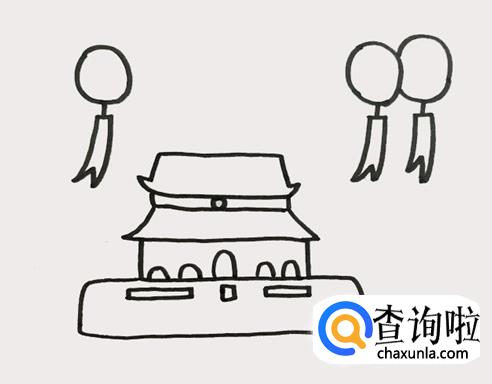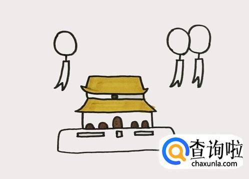 再在建筑的上方两侧画出气球后,还要画出挂在气球上的条幅。