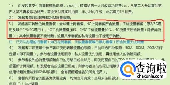我们如果没开通过这个业务的,系统就会自动弹出一个开能说明,这里,我们注意我们如果要将流量转赠给别人,是需要支付5元的需要注意的是费用的,而且,转增流量是有人数限制的,每次最多有4人的限制,而且并不是所有的流量都可以赠送的,只有系统显示的可赠送的流量,才可以赠送给别人。