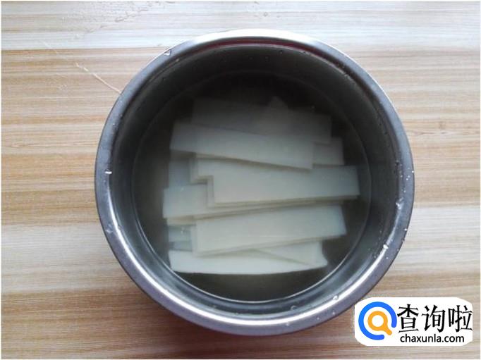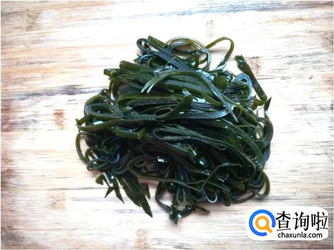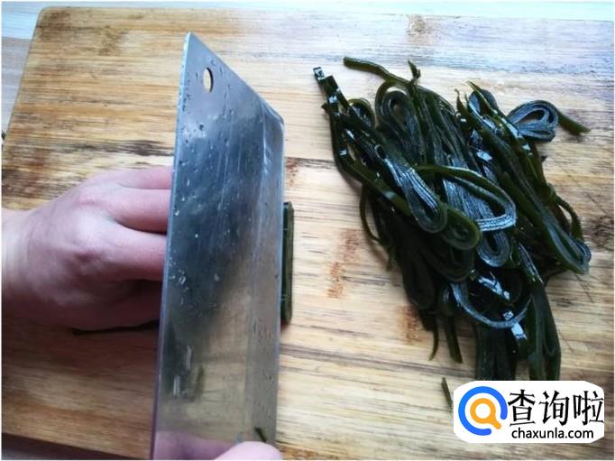 购买一些湿海带(这种海带比较煮软),将海带洗净,洗的时候一定要仔细,因为在海带的一些沟槽中含有一些泥沙,如果不洗干净会咯牙的。洗净后,将海带切成细丝。