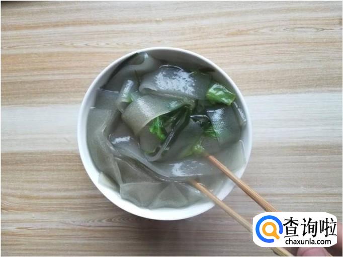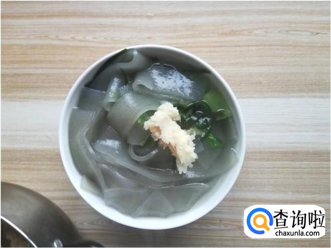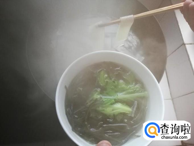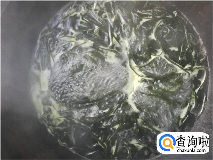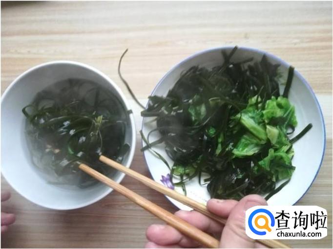 清水煮海带丝和莲白5-8分钟后,将其捞起,并取一部分放在碗里,碗里盛上一些开水。