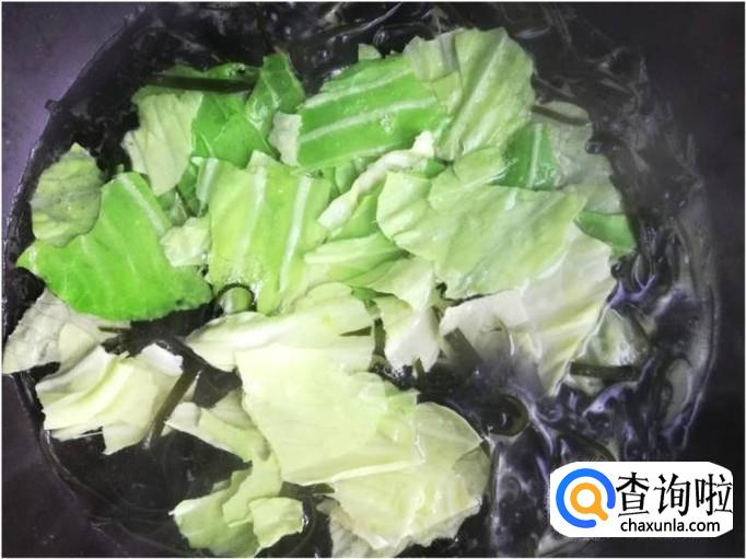 将锅里烧开水,然后将莲白和海带丝倒入锅内。