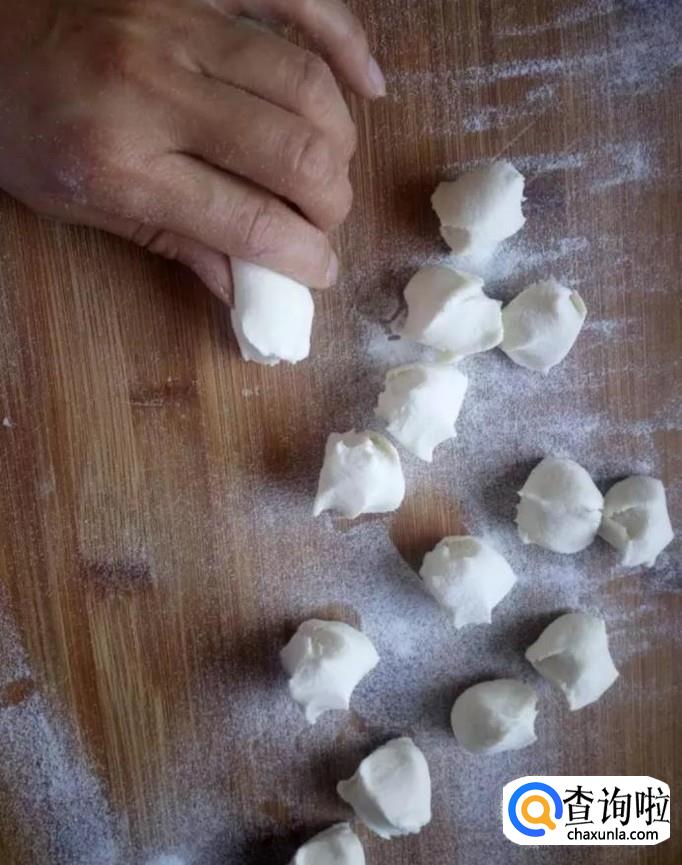 将揉好的面团分成一小个一小个的小面团并用擀面杖将其擀成薄薄的小面片