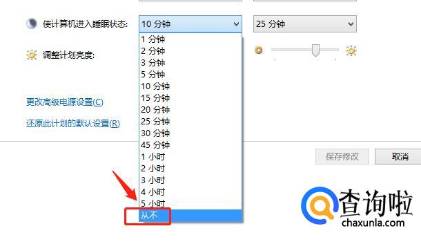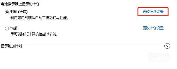 然后进入如下界面,点击如图所示的【更改电源计划】,将进入睡眠时间选项改为【从不】,如下图所示。