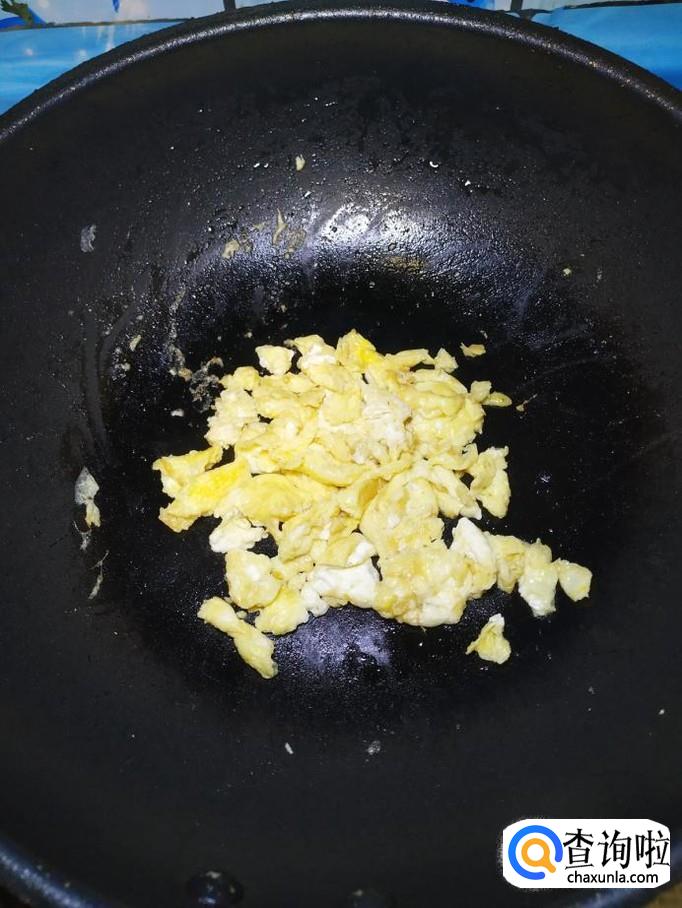 炒锅中放入适量油,油热后将鸡蛋液倒入锅中炒香,出锅装盘备用。