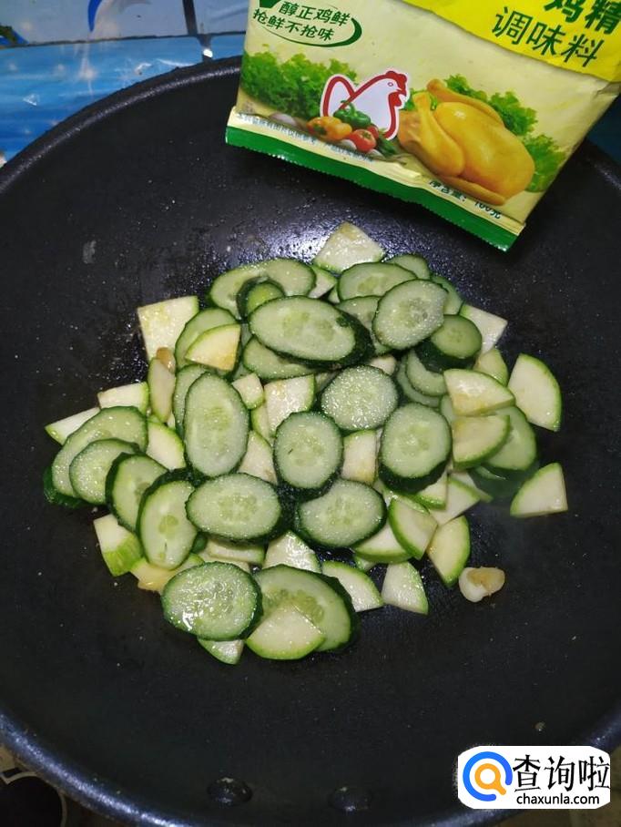炒锅中再放入少许油,加入适量蒜片爆香,然后将西葫芦和黄瓜倒入锅中,翻炒均匀。