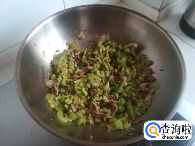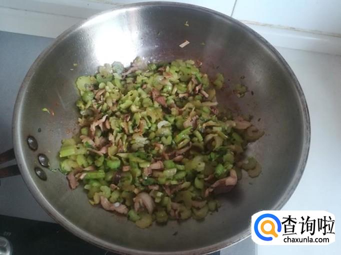 再放入切好的芹菜香菇翻炒至断生,可以滴入1小勺清水,以免糊锅。