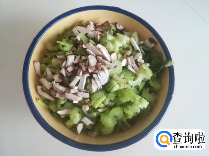 把芹菜洗净去筋横切成片,香菇去蒂洗净切成条。