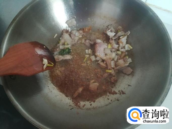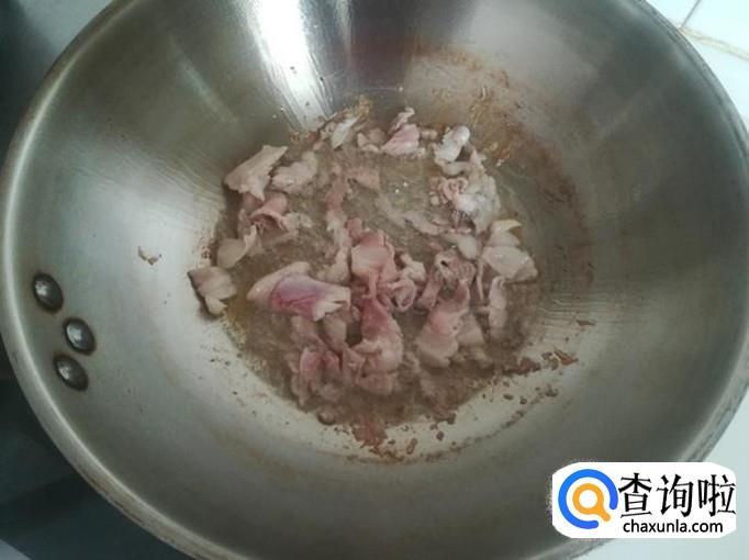 炒锅放入花生油,等油六成熟时,把肉片入锅炒到变色。