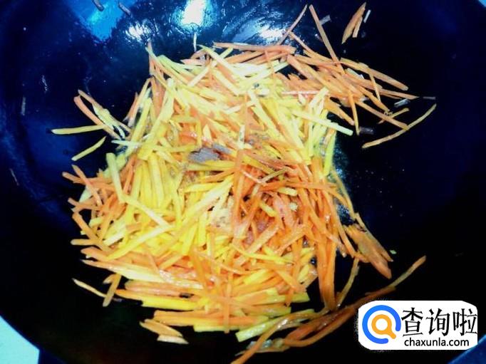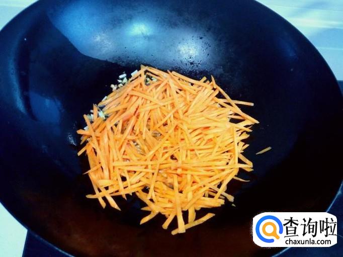 锅内放入油加热,油热后放入葱,姜爆香,放入胡萝卜丝翻炒。