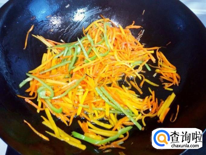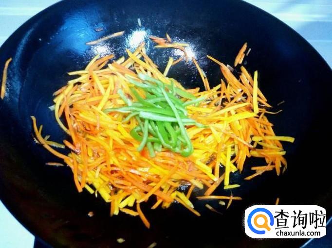 炒至胡萝卜,南瓜丝断生,放入青尖椒略翻炒一下,放入少许味精,关火出勺。