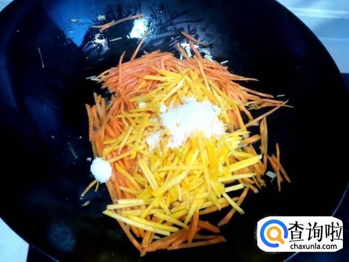 胡萝卜丝稍炒一下,随即放入南瓜丝,放入一匙儿白糖,一匙醋,少许耗油,少许五香粉,少许盐,大火快速翻炒。