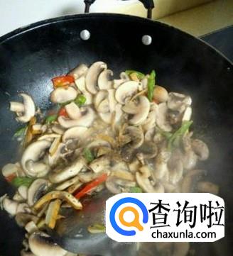 接着将口菇片放入,反复翻炒,炒出水来后将食盐放入,再继续翻炒30秒。