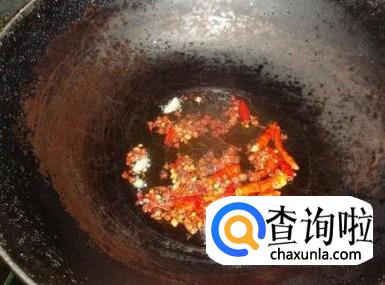 锅里放入少许的油,待油热后将辣椒和蒜头放入爆香。