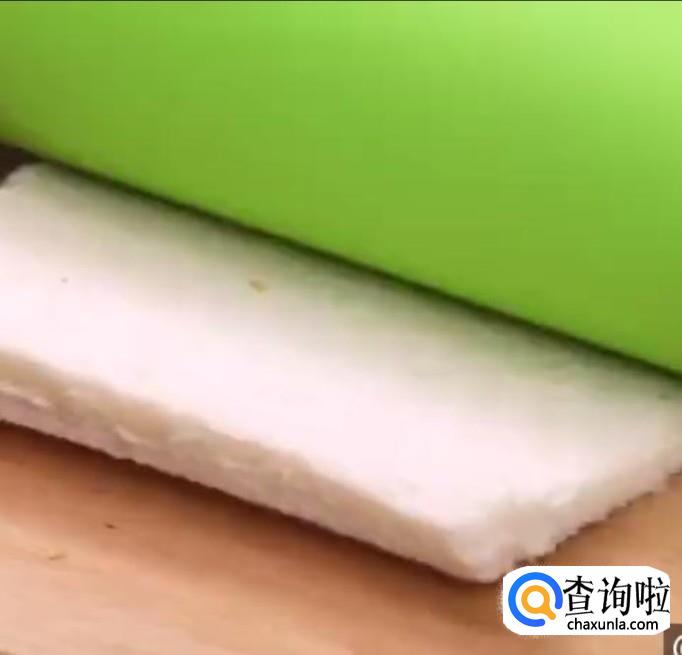 将吐司压成大小合适的圆形,擀薄后做成四叶草的形状,放入蛋糕模具中。