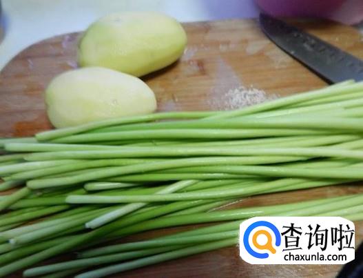 将土豆去皮,蒜薹去根和苗,然后将土豆和蒜薹用清水洗净。