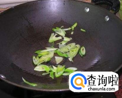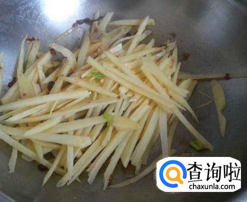 锅中放入食用油烧热,放入葱花炝锅,再放入土豆条翻炒均匀。