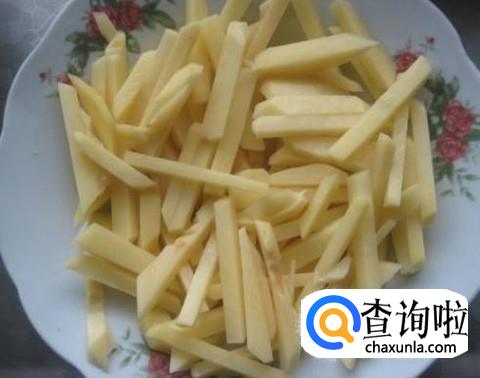 将蒜薹切成寸段,土豆切成一寸长的条。