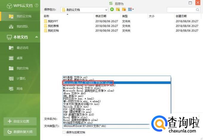 然后我们点击文件类型的下拉箭头,弹出的界面,我们可以2003版本;